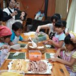 金先生のお手本を見ながら、みんな巻きす初体験!手にご飯がくっつかないようにするには?どうしたらきれいになるかな?etc…普段家ではなかなか体験できないヒントがいっぱい詰まったキンパ作りに子供達もやる気満々でした!